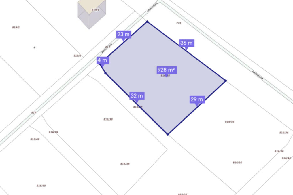 Powierzchnia: 929 m2 (0,0929 ha)Numer działki: 816/35Przeznaczenie: